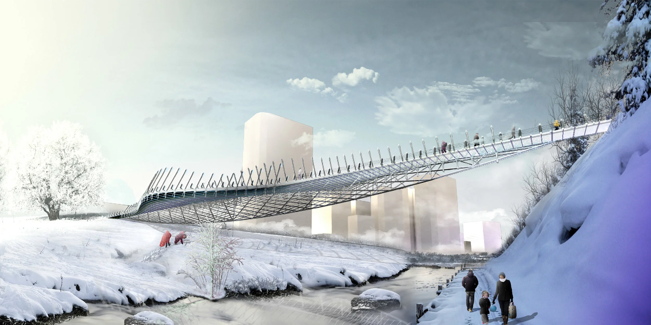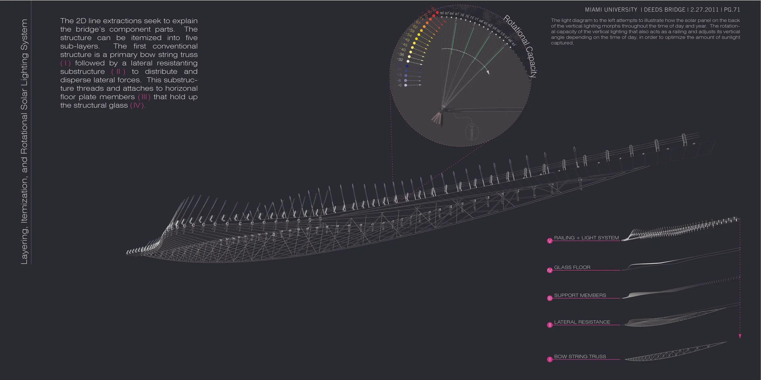 Attached to the railing system is a light exterior skin composed of solar panels that charge throughout the day, with the end goal to illuminate the bridge at night, using its stored energy. As for its morphology, the large light posts, that also act as a railing system, incline and decline based on the alignment of the sun, such that the light-posts are perpendicular to the sun, in order to optimize the amount of energy retained.